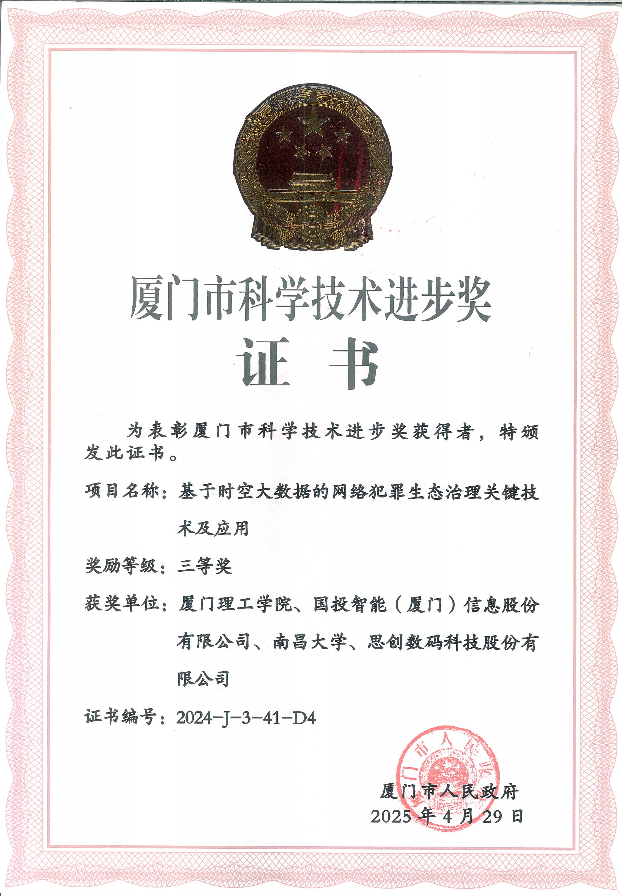 近日,思创与厦门理工学院、国投智能(厦门)信息股份有限公司、南昌大学等单位合作完成的《基于时空大数据的网络犯罪生态治理关键技术及应用》项目荣获2024年度厦门市科技进步三等奖。