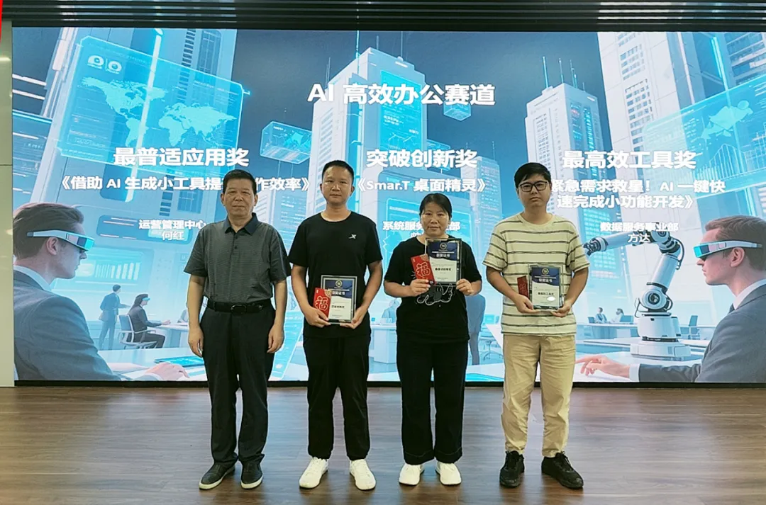 颁奖仪式伊始,余总发表了重要讲话。他表示,人工智能作为新质生产力的核心引擎,正深刻改变着工作与生活的范式。他强调,本次大赛不仅是技术成果的展示平台,更是公司推动 “AI + 业务” 深度融合的重要实践。通过赛事,我们看到了员工将 AI 技术转化为实际应用的创造力。未来,公司将持续加大对 AI 技术的投入,为员工提供更多创新实践的机会,希望大家踊跃参与。